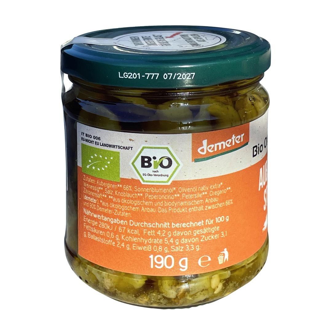 Unsere Bio Auberginen in Öl stammen aus Italien und werden nach Demeter-Standards hergestellt. Die zarten Auberginenstreifen sind in hochwertigem Öl eingelegt und eignen sich perfekt für mediterrane Gerichte, Apéro-Platten, Pasta, Sandwiches oder Antipasti. Wer nachhaltige Qualität und authentischen Geschmack sucht, findet hier ein echtes Premiumprodukt.