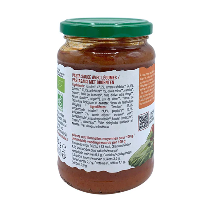 Tomaten** 47,5 %, getrocknete Tomaten** 24,4 %, Paprika** 10,7 %, Artischocken** 7 %, schwarze Oliven**, Karotten**, Zwiebeln**, Sonnenblumenöl*, natives Olivenöl extra**, Basilikum** 1,6 %, Petersilie**, Thymian**, Oregano**, Zitronensaft**, Basilikum**, Oregano**.